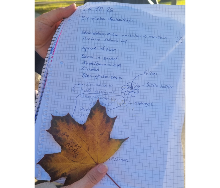Im naturwissenschaftlichen Laborunterricht hat die 5A heute dem starken Wind getrotzt und die verschiedenen Baumarten im Schulhof und Stadtpark unter die Lupe genommen. Unter anderem konnten Kiefer, Linde, Eibe, Eiche, Blutbuche, Ahorn, Ginko, und auch Blauglockenbaum bestimmt werden. Auch ein paar grüne Triebe wurden entdeckt, was ungewöhnlich ist und mit dem Klimawandel zusammenhängt. Die Beobachtungen in der Natur boten einen interessanten Einstieg in die Herbstferien!
