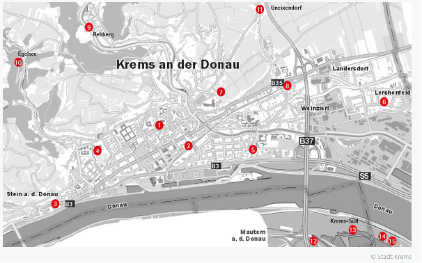 Wir verweisen auf die INFO-Punkte der Stadt Krems – nächstgelegener INFO Punkt am Bahnhofplatz.