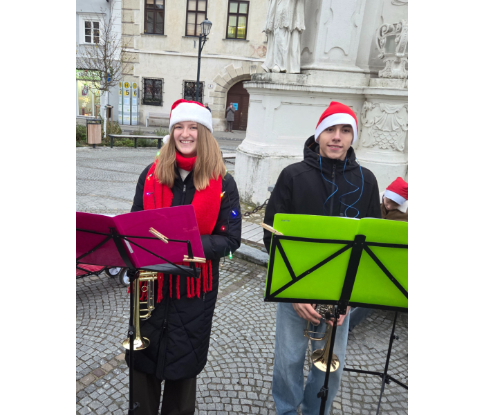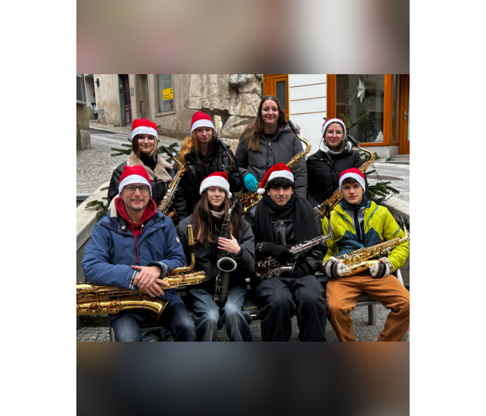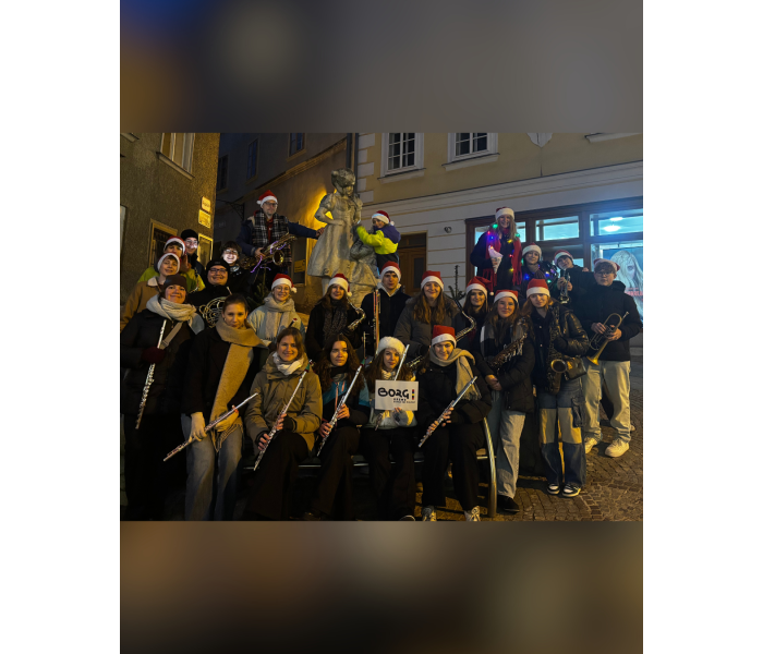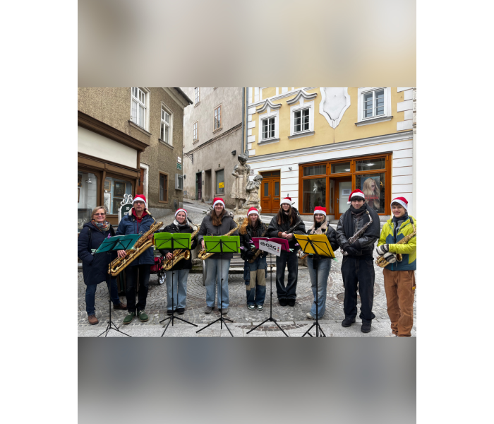 Ausgerüstet mit Piccolo, Flöten, Trompeten, Posaune, Horn, Saxophonen und Schlagwerkinstrumenten zogen Schülerinnen und Schüler des BORG-Krems am Donnerstag, dem 4. Dezember 2025 durch die Kremser Innenstadt und beschallten diese mit weihnachtlichen Klängen.