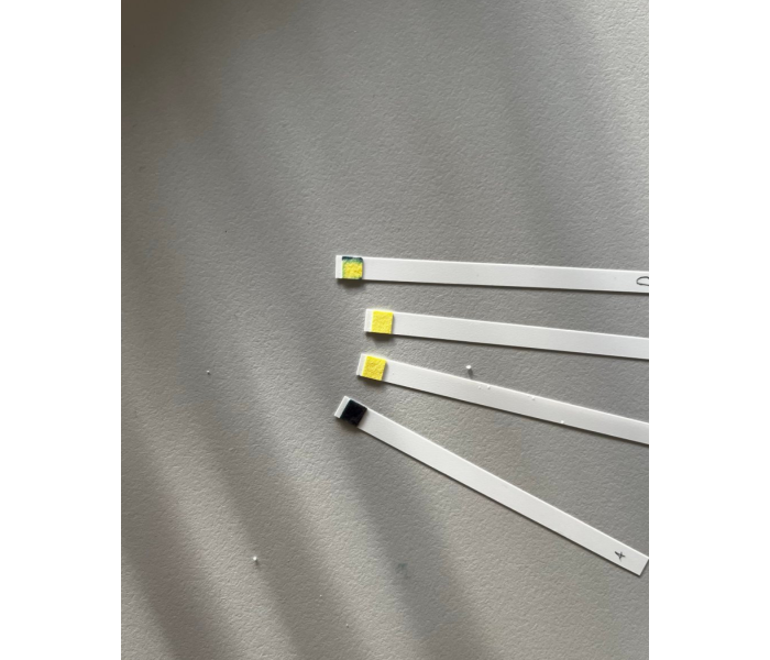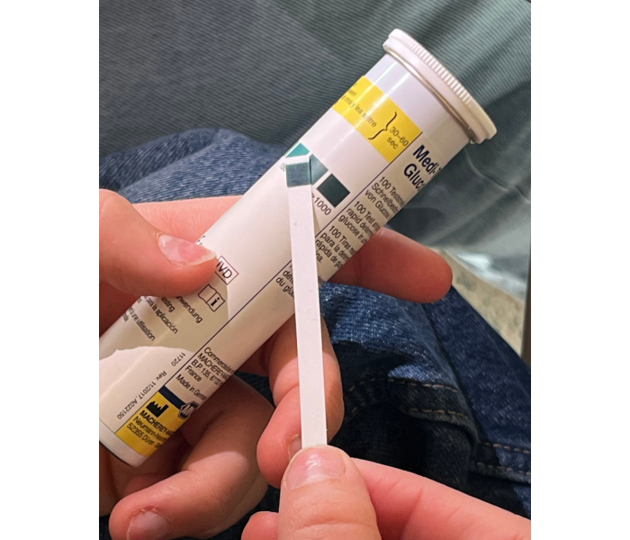 Zuerst wurden Wasser + Glucose, Wasser + Zitronensäure, Wasser + Saccharose, Wasser + Saccharose + Zitronensäure mit Glucose-Teststreifen untersucht. Diese kennt man normalerweise aus der Diabetesdiagnostik, denn sie reagieren ausschließlich auf Glucose (Traubenzucker).