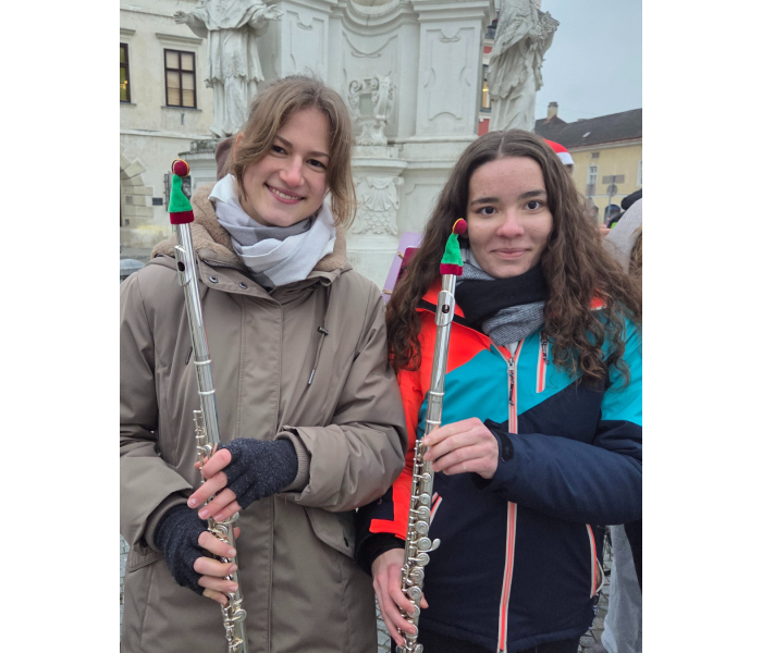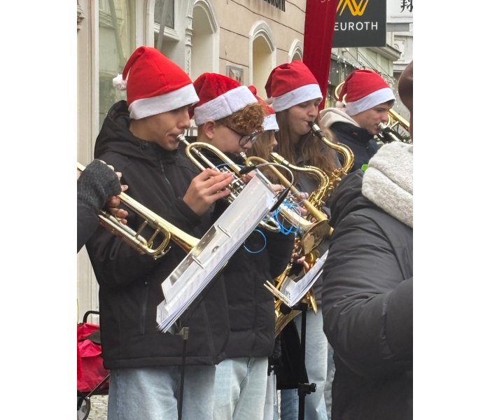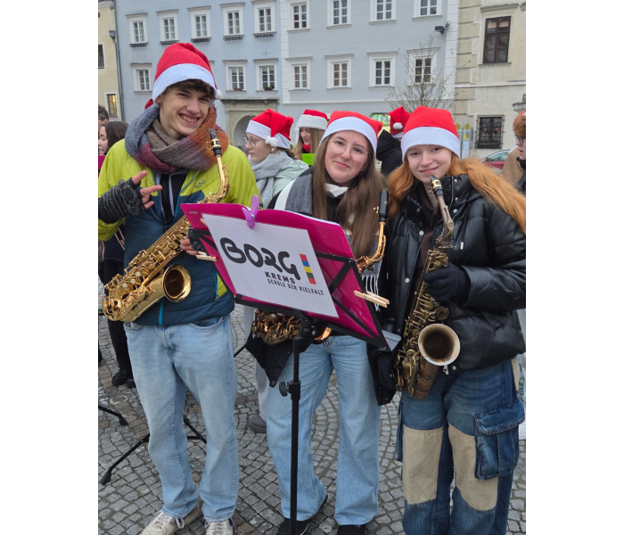 Ausgerüstet mit Piccolo, Flöten, Trompeten, Posaune, Horn, Saxophonen und Schlagwerkinstrumenten zogen Schülerinnen und Schüler des BORG-Krems am Donnerstag, dem 4. Dezember 2025 durch die Kremser Innenstadt und beschallten diese mit weihnachtlichen Klängen.