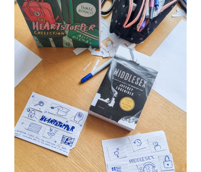 Mit großem Eifer nahmen die Schülerinnen und Schüler des Schulfaches E+ unter der Leitung von Prof. Vera Prinz die neu angekaufte LGBTQIA+-Literatur der BORG-Bibliothek unter die Lupe. Es entstand dabei die Idee, zu den englischsprachigen Werken Infos bereitzustellen, damit zukünftige Leser*innen gleich eine Vorstellung vom Inhalt und der Art der Bücher bekommen. Das Resultat waren kleine Info-Zettelchen und kreative Buchbeschreibungen.